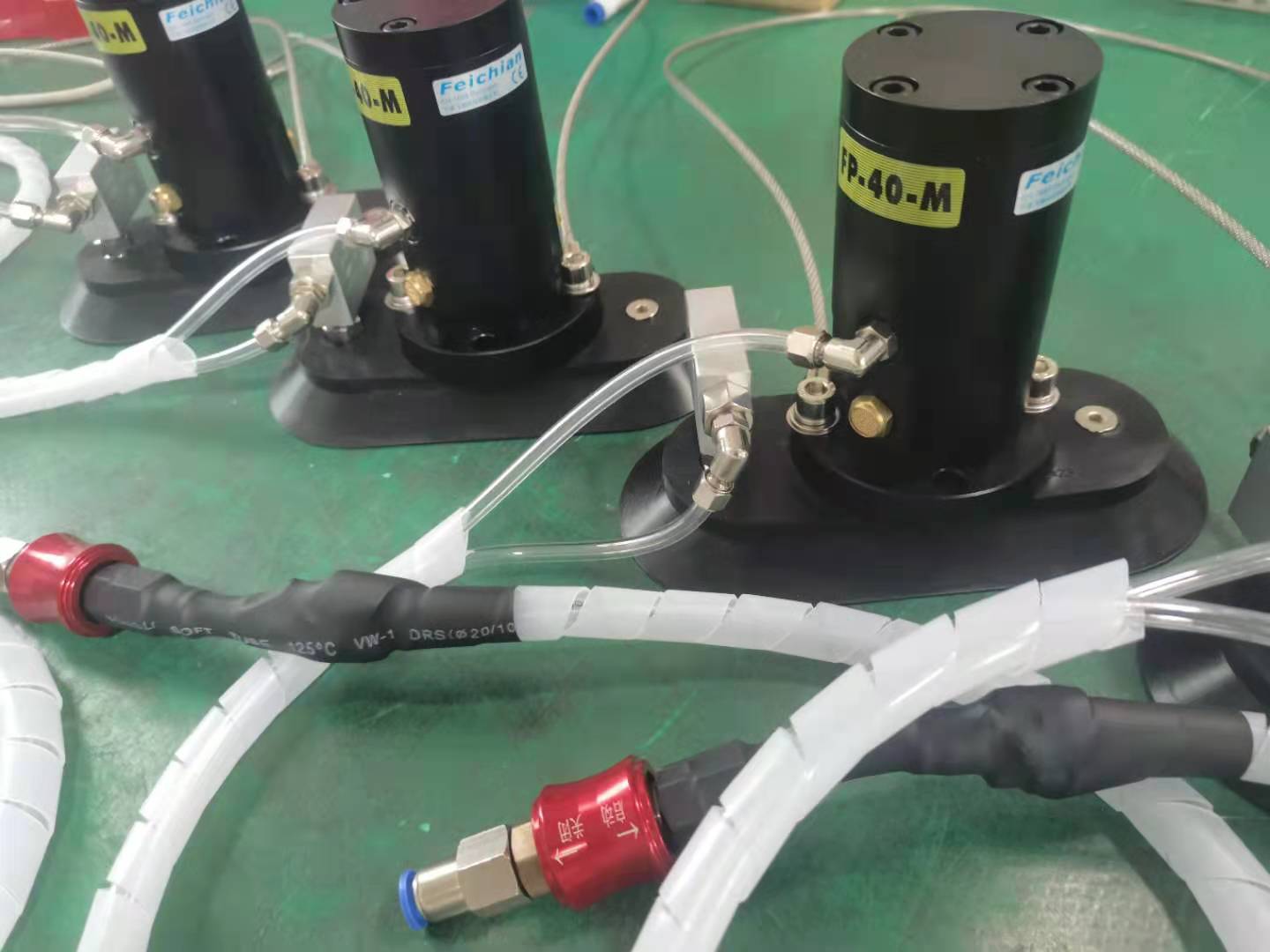 吸盘式气动振动器的特点(GT系列,FP系列等) 特性 (柔性解决-方案 - 吸住、振动、取下) 1、临时振动的选择,快速有效的解决方案 2、结构简洁紧固,特种铝合金,轻巧方便 3、连接简单,与振动器共用压缩空气 4、真空吸附,及振动分别控制 5、配有二根安全链条.及两端手握.方便操作